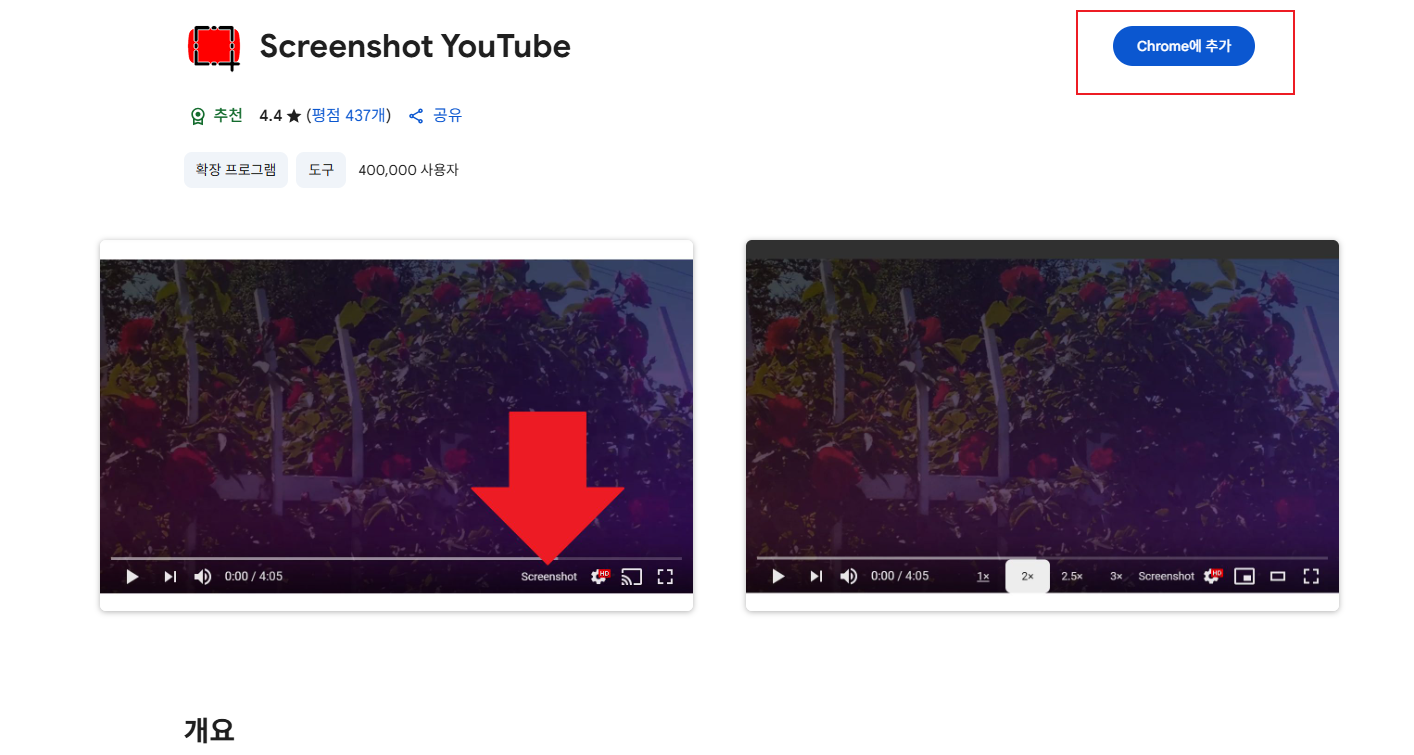 크롬 웹스토어에서 'Screenshot YouTube' 검색 또는 아래 링크 클릭 후 'Chrome에 추가'만 누르면 완료!